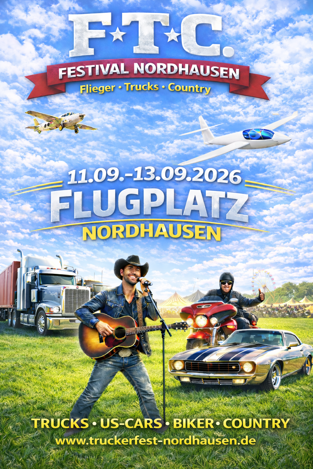 Im September 2026 feiert das F.T.C. Festival auf dem Flugplatz Nordhausen sein großes Comeback anlässlich des 70-jährigen Bestehens des Flugplatzes Nordhausen. Besucher dürfen sich auf ein einzigartiges Festival freuen, das Trucks, Country-Musik, Line Dance und Fliegerei in einer außergewöhnlichen Kulisse vereint.