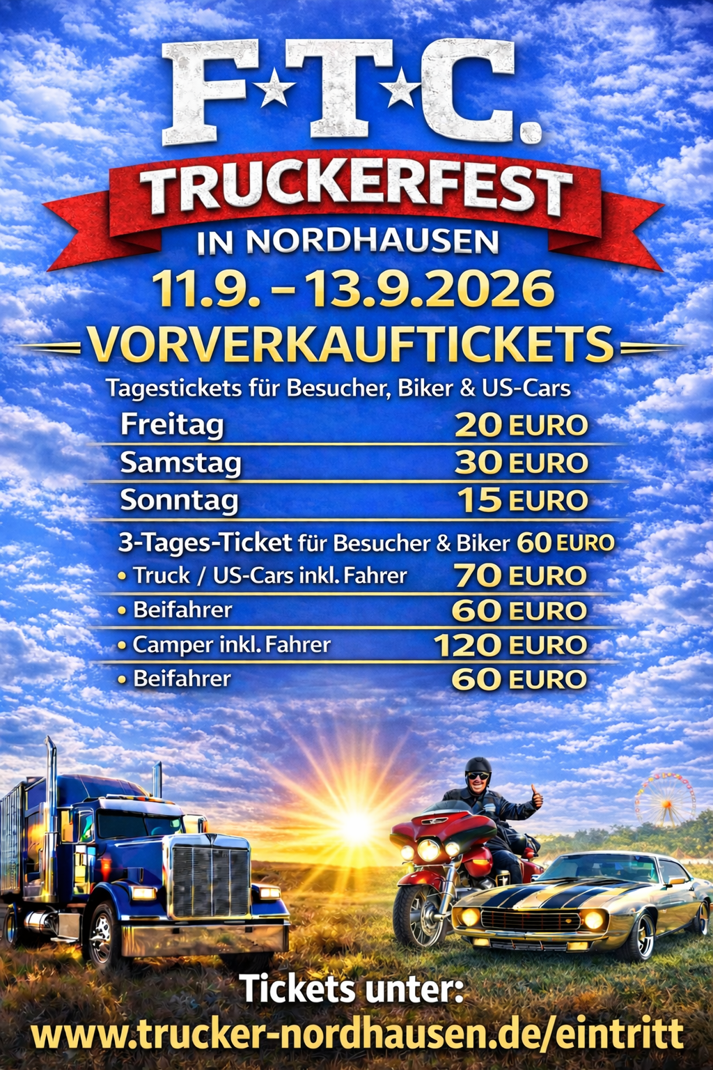 Der Vorverkauf für das F.T.C. Festival Nordhausen 2026 umfasst spezielle Trucker-Tickets sowie 3-Tages-Tickets für Besucher und Camper. Darüber hinaus sind attraktive Gruppenangebote erhältlich.